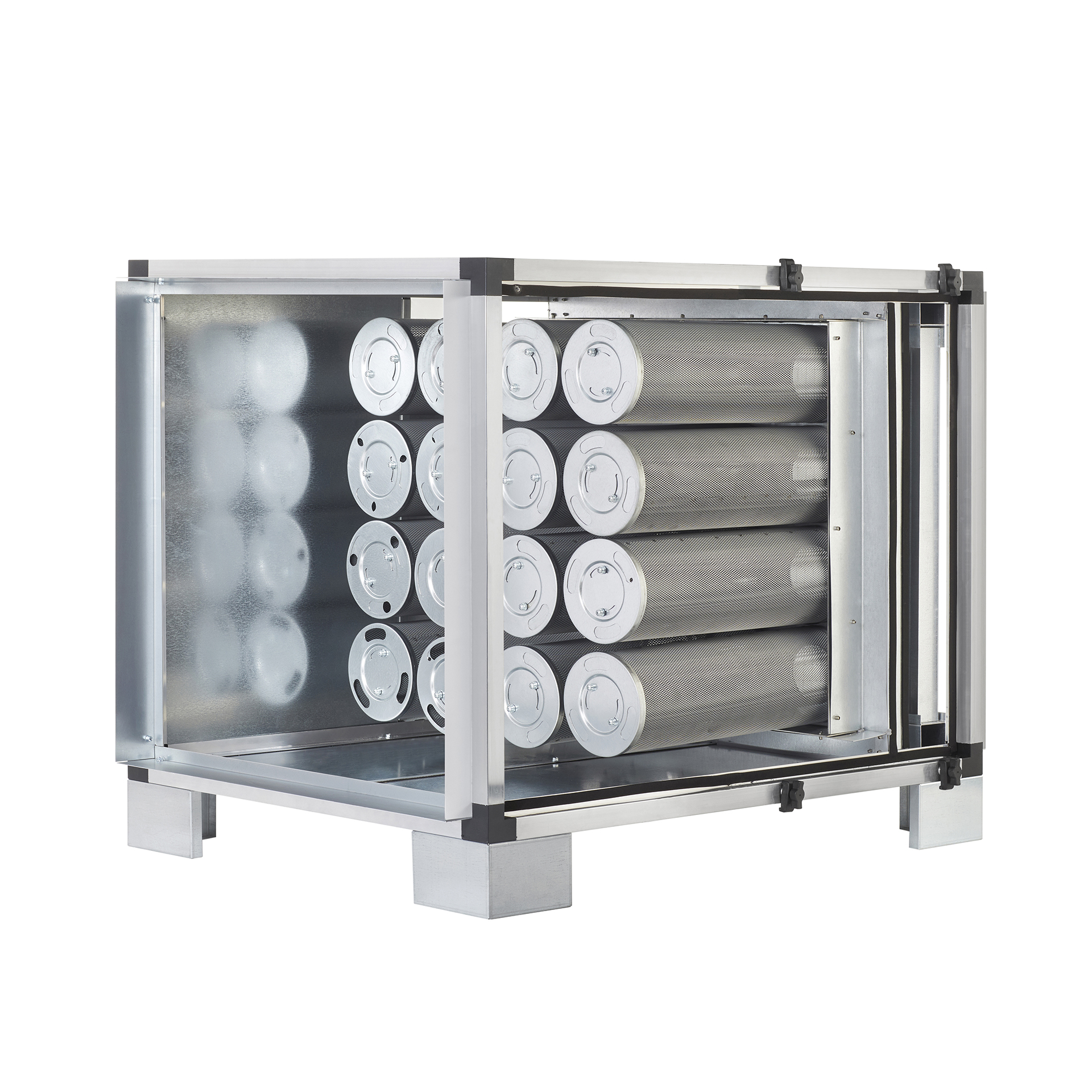 Equipos, Climas y sistemas Los intercaladores de conducto son sistemas modulares para la colocación de prefiltros, filtros de bolsas compactos, absolutos o carbón activo donde se requiera una elevada calidad de aire para obtener un alto grado de limpieza o pureza ambiental con una etapa o varias de filtración. Boxhepa. Boxcarb. Box.